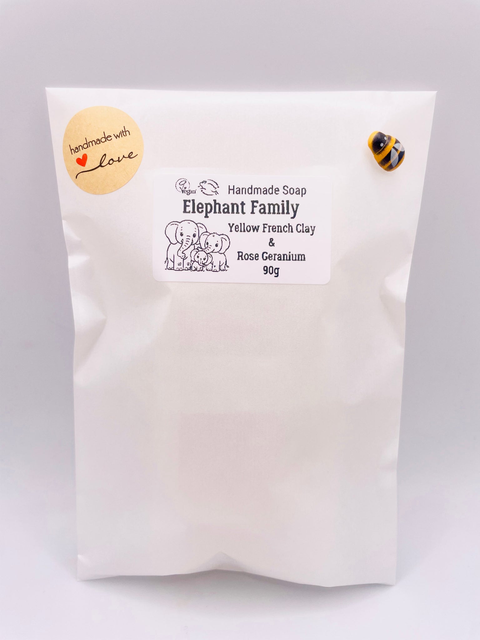 Handmade vegan soap featuring an elephant family with baby elephant and packed in beautiful eco friendly packaging. crafted with natural French clays, activated charcoal and essential oils. a eco-friendly, zero waste gift that’s cruelty-free, skin-nourishing, and perfect for elephant lovers or animal themed gifts. Small business UK