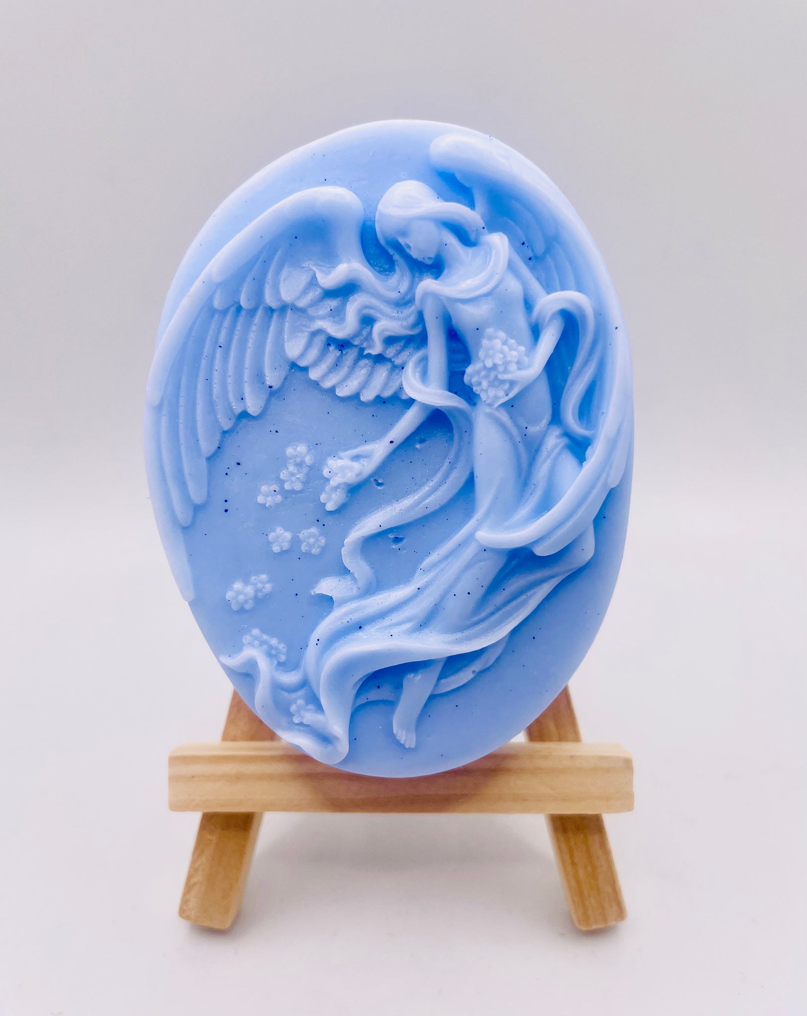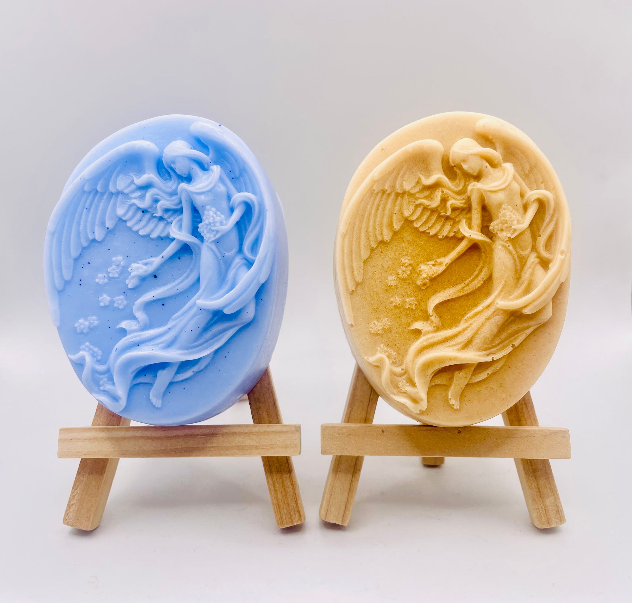 Handmade vegan Guardian Angel soap bar, features a detailed angel with flowing wings. Natural, cruelty-free UK soap ideal for spiritual gifts, zero waste skincare, and sustainable bathroom décor. British-made artisan soap perfect for eco-conscious shoppers. Wrapped in beautiful eco friendly packaging . Small business UK