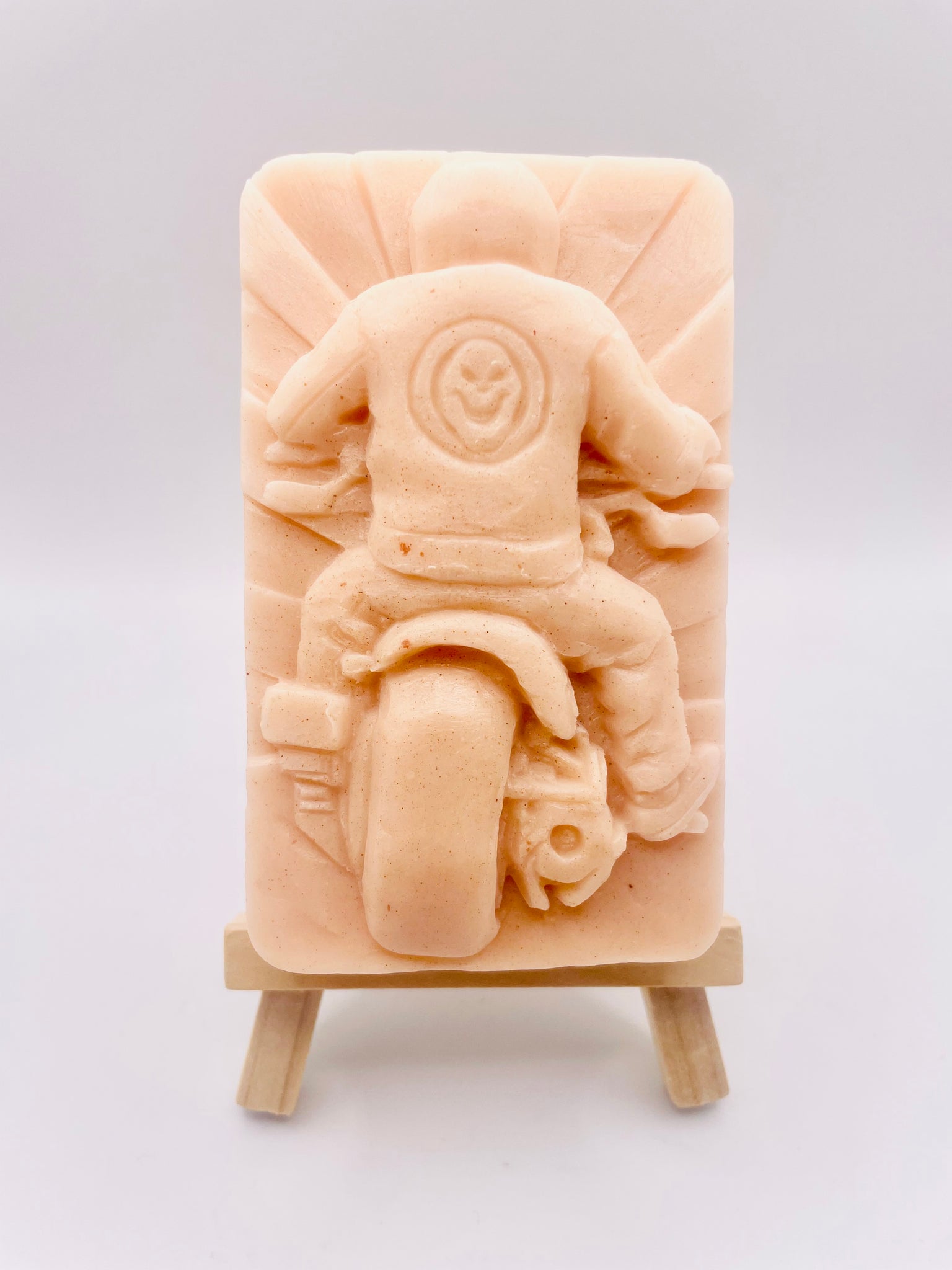 Rev up your skincare routine with our motorbike-inspired vegan soap! 💨 This handmade, vegan soap features a biker cruising off into the sunset, made with your choice of natural French clay colour and pure essential oil. Vegan & cruelty free soap.