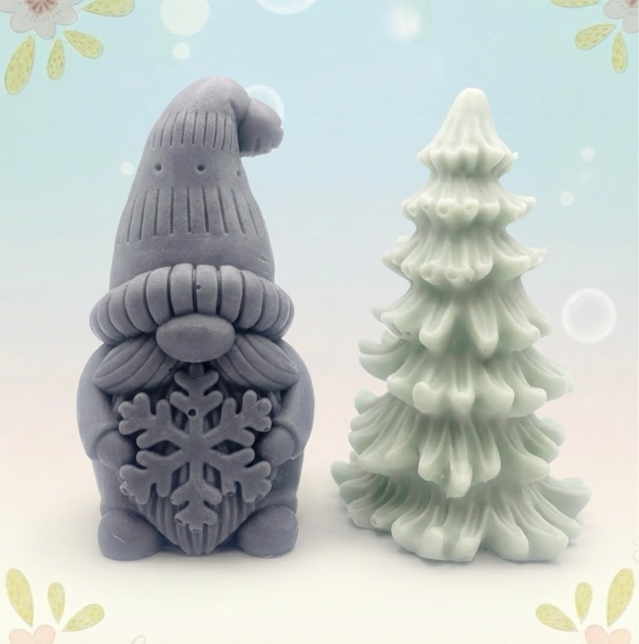 Handmade vegan snowdrop gnome and Christmas tree shaped vegan soaps gift boxed.  crafted with natural French clays, activated charcoal and essential oils. a eco-friendly, zero waste gift that’s cruelty-free, skin-nourishing, and perfect for gifting.