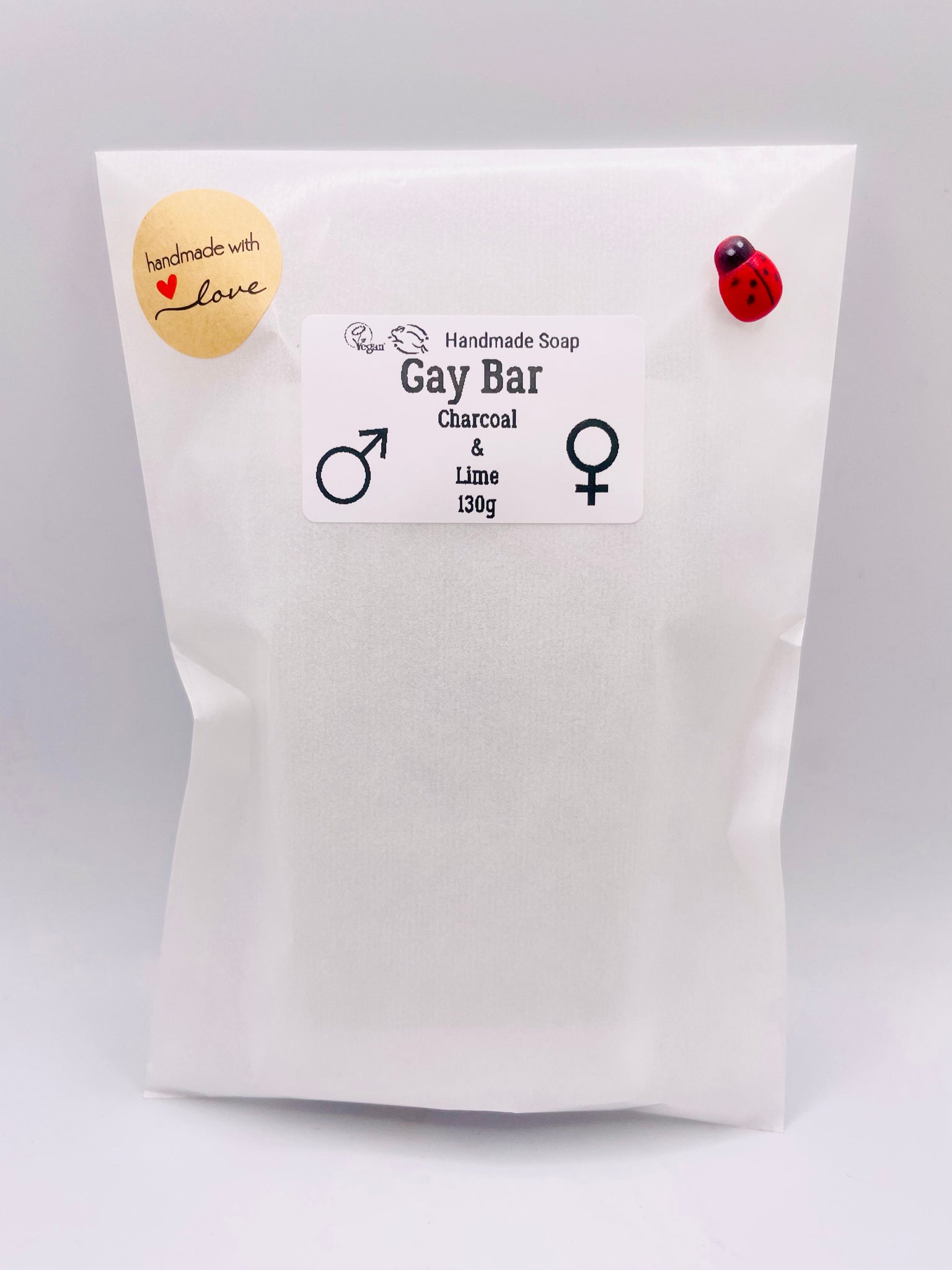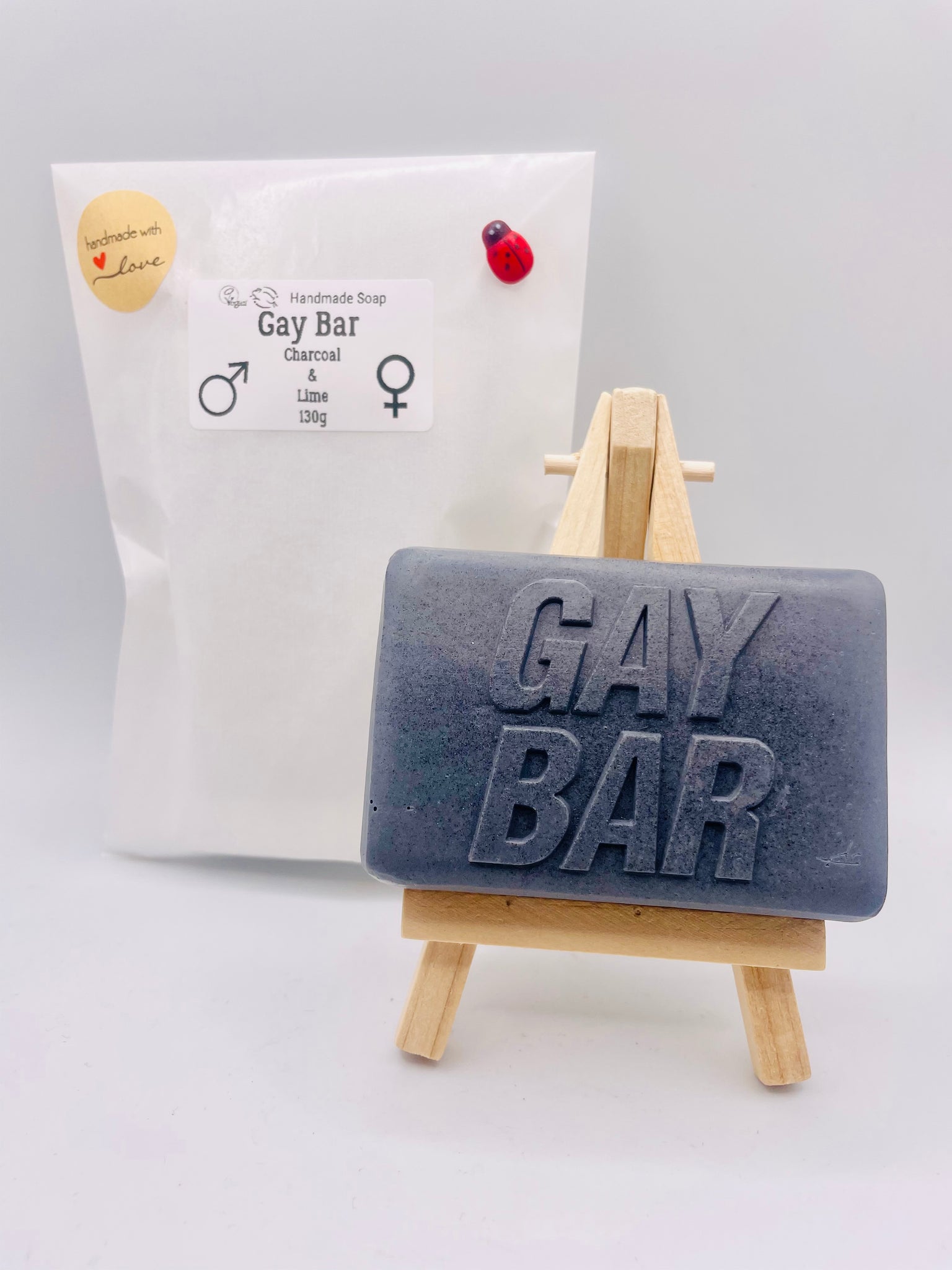 Handmade vegan soaps featuring the wording GAY BAR novelty gift. crafted with natural French clays, activated charcoal and essential oils. a eco-friendly, zero waste gift that’s cruelty-free, skin-nourishing, and perfect for pride gifts and LGBTQ gifts, hen party favours. wrapped in beautiful eco friendly packaging.