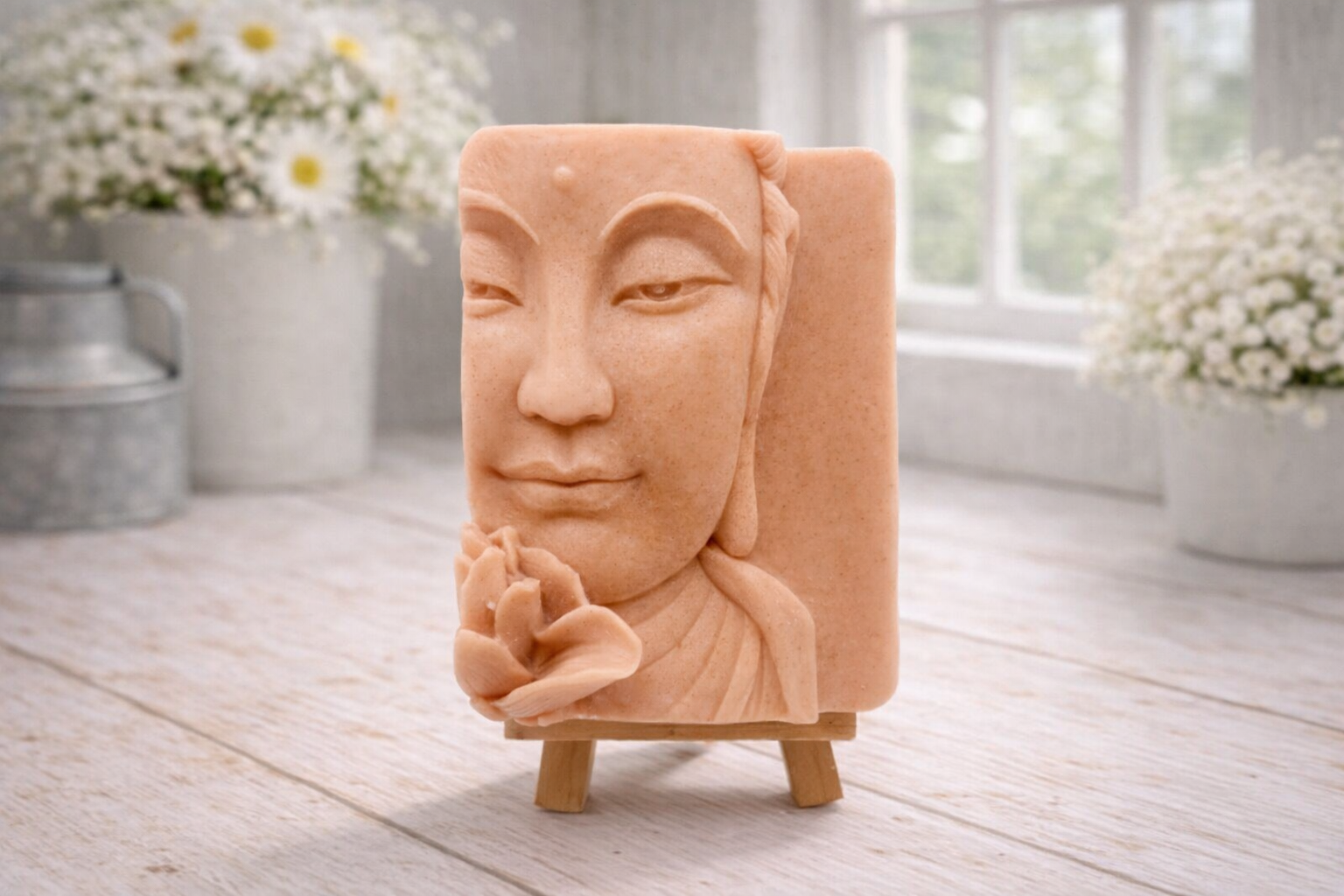 If your daily routine feels more like a circus than a sanctuary, our handmade Buddha & Lotus Flower vegan soap is here to help you find your "om"! Much more than a simple bar of soap, this is a stunningly detailed piece of handmade décor featuring a peaceful Buddha resting beside a delicate lotus flower.