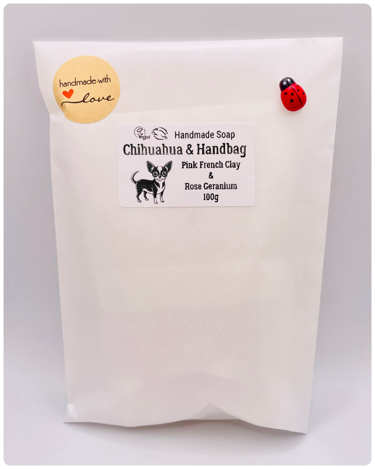 This super cute soap features an adorable Chihuahua peeking out of a stylish handbag! Handmade with natural French clays and soothing essential oils, this soap is perfect for pampering your skin. It’s vegan, cruelty-free, and wrapped in the sweetest eco-friendly packaging, making it as kind to the planet as it is to your skin. Treat yourself (or someone special) to a soap that’s as fun as it is gentle! The perfect gift for Chihuahua owners and dog lovers.